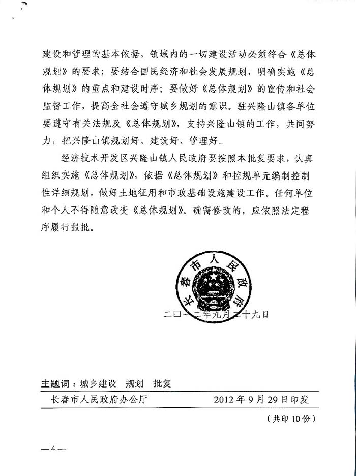 长春市人民政府关于长春经济技术开发区兴隆山镇总体规划(2011-2020)的批复