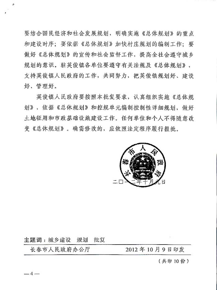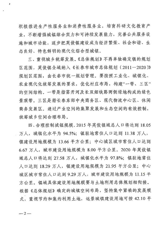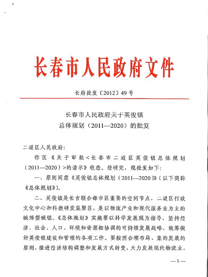 长春市人民政府关于英俊镇总体规划(2011-2020)的批复