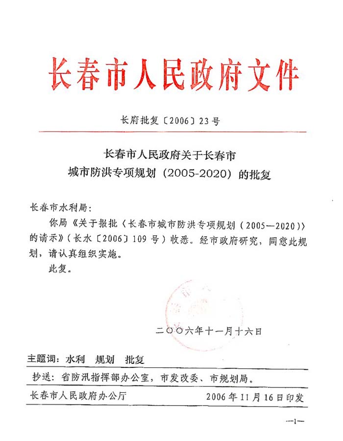 长春市人民政府关于长春市城市防洪专项规划(2005-2020)的批复