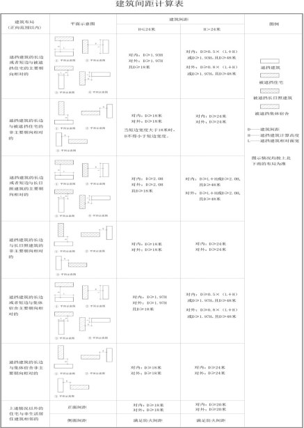 第十九条遮挡建筑计算高度大于24米,被遮挡建筑为新建生活居住建筑的,新建建筑之间、既有建筑与新建建筑之间的建筑间距按照下列标准执行: