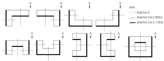 (二)“L”形、“U”形、“回”形住宅按照条式住宅叠加的方式确定主要朝向和主日照面。“L”形、“U”形、“回”形住宅的主要朝向、主日照面如附图2所示。