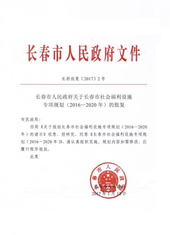 长春市人民政府关于长春市社会福利设施专项规划(2016-2020年)的批复