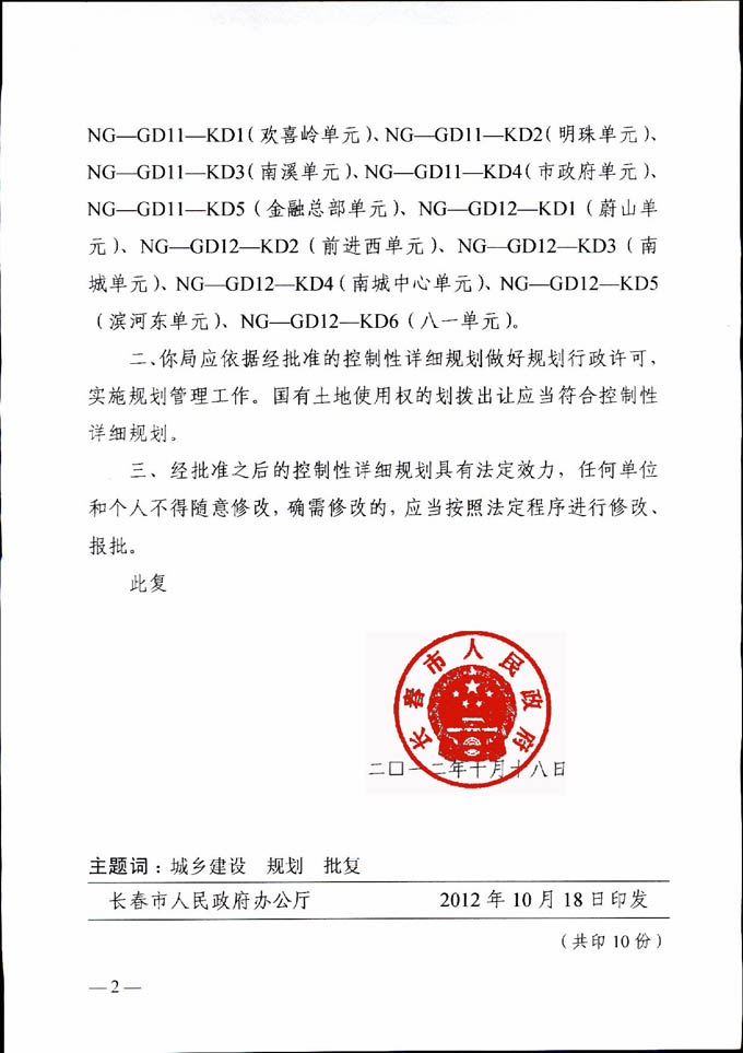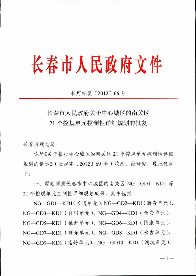 长春市人民政府关于中心城区的南关区21个控规单位控制性详细规划的批复
