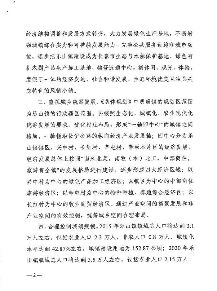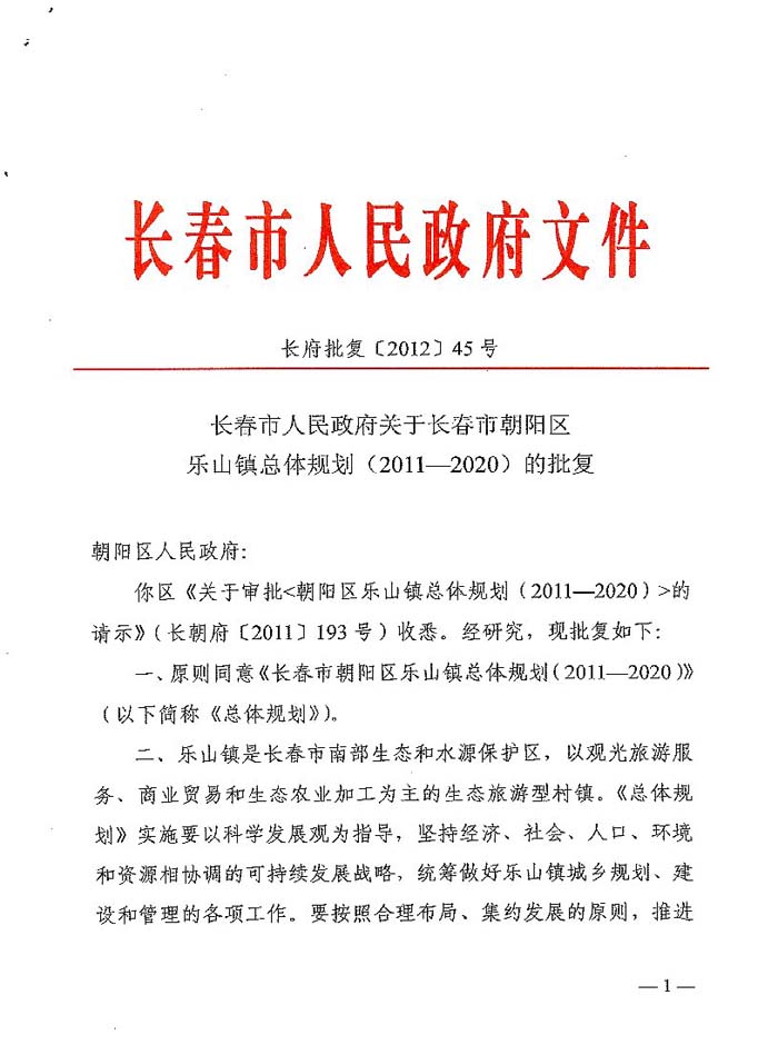 长春市人民政府关于长春市朝阳区乐山镇总体规划(2011-2020)的批复