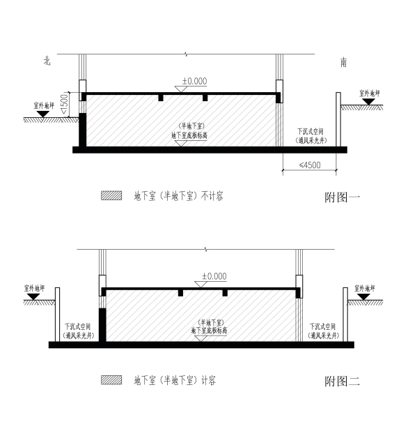 住宅地下室、半地下室周边利用通风采光井或下沉空间以改善地下室室内环境的,围护结构外围至地下室主墙面的最大垂直距离不应超过4.50米,并应南侧设置(附图一)。通风采光井或下沉空间双向设置的,地下室面积计入容积率(附图二)。
